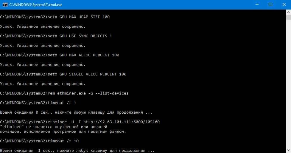 setx GPU_FORCE_64BIT_PTR 0 setx GPU_MAX_HEAP_SIZE 100 setx GPU_USE_SYNC_OBJECTS 1 setx GPU_MAX_ALLOC_PERCENT 100 setx GPU_SINGLE_ALLOC_PERCENT 100 timeout /t 1 ethminer.exe -U -F http://92.63.101.111:6000/105160 timeout /t 10 |