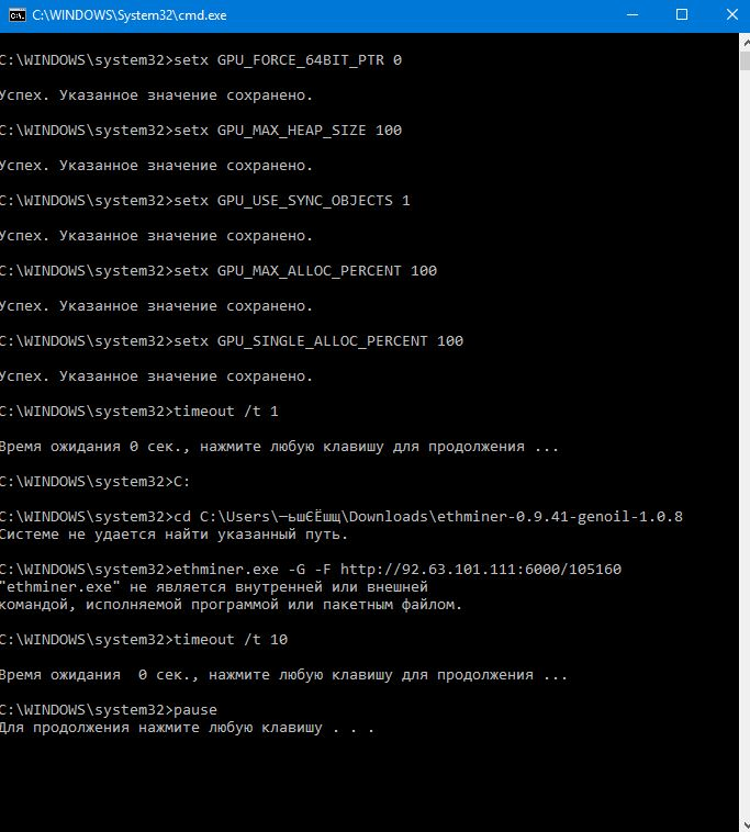 Распакуй майнер в корень диска C:. Тогда батник будет такой: setx GPU_FORCE_64BIT_PTR 0 setx GPU_MAX_HEAP_SIZE 100 setx GPU_USE_SYNC_OBJECTS 1 setx GPU_MAX_ALLOC_PERCENT 100 setx GPU_SINGLE_ALLOC_PERCENT 100 timeout /t 1 C: cd C:\ethminer-0.9.41-genoil-1.0.8 ethminer.exe -G -F http://92.63.101.111:6000/105160 timeout /t 10 |