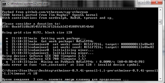 Виталий Дрозд писал(а): В начале могут бежать нули какое-то время. Подождите немного. Попробуйте майнер из последних. ethminer-0.9.41-genoil-1.1.х |