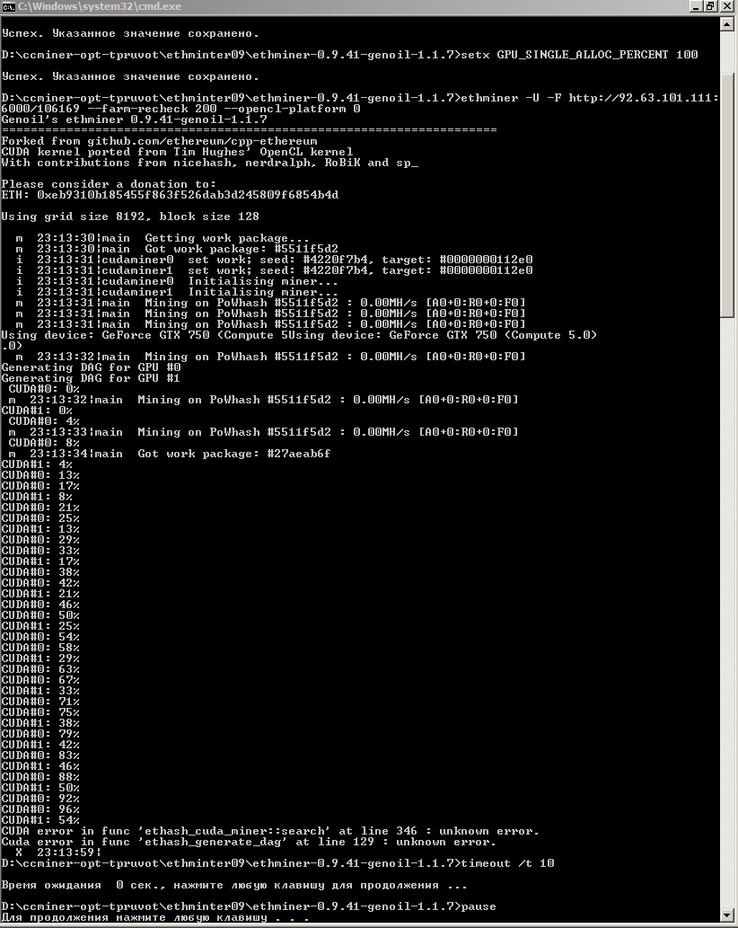 Алексей Королёв: ты попробуй мой батник ! если так не пойдет G замени на U у меня была проблема одна давно G или U должны быть за ип пула !!) попробуй так может получится setx GPU_FORCE_64BIT_PTR 0 setx GPU_MAX_HEAP_SIZE 100 setx GPU_USE_SYNC_OBJECTS 1 setx GPU_MAX_ALLOC_PERCENT 100 setx GPU_SINGLE_ALLOC_PERCENT 100 timeout /t 1 ethminer -F 92.63.101.111:6000/101395 -G --opencl-platform 0 --farm-recheck 250 timeout /t 10 Пробовал. Слетает драйвер. Пробовал на старом майнере - он стал качать DAG и после все равно вылетел драйвер |