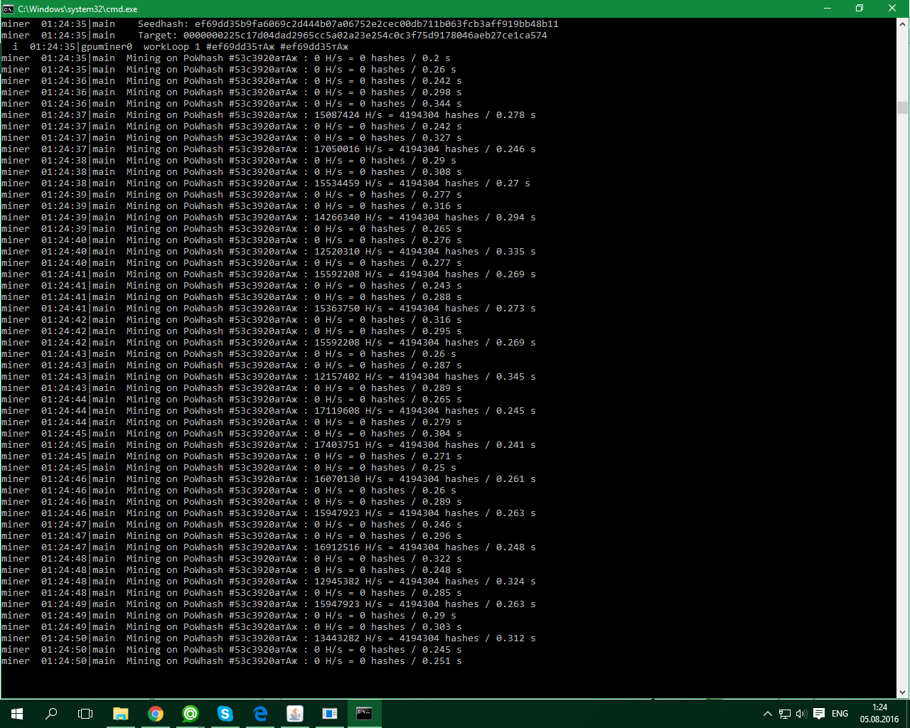 Не знаю, какой у вас батник, но попробуйте так, может скорость побольше станет: setx GPU_FORCE_64BIT_PTR 0 setx GPU_MAX_HEAP_SIZE 100 setx GPU_USE_SYNC_OBJECTS 1 setx GPU_MAX_ALLOC_PERCENT 100 setx GPU_SINGLE_ALLOC_PERCENT 100 timeout /t 1 ethminer -G -F http://92.63.101.111:6000/101162 --farm-recheck 3000 --cl-global-work 16384 --cl-local-work 128 timeout /t 10 101162 замените на свой номер вокера. И скрин сделайте не сразу после запуска, а минуты через 2-3. Максимальная скорость достигается не сразу. Киньте скрин через пару минут после запуска, посмотрим, что выйдет. |