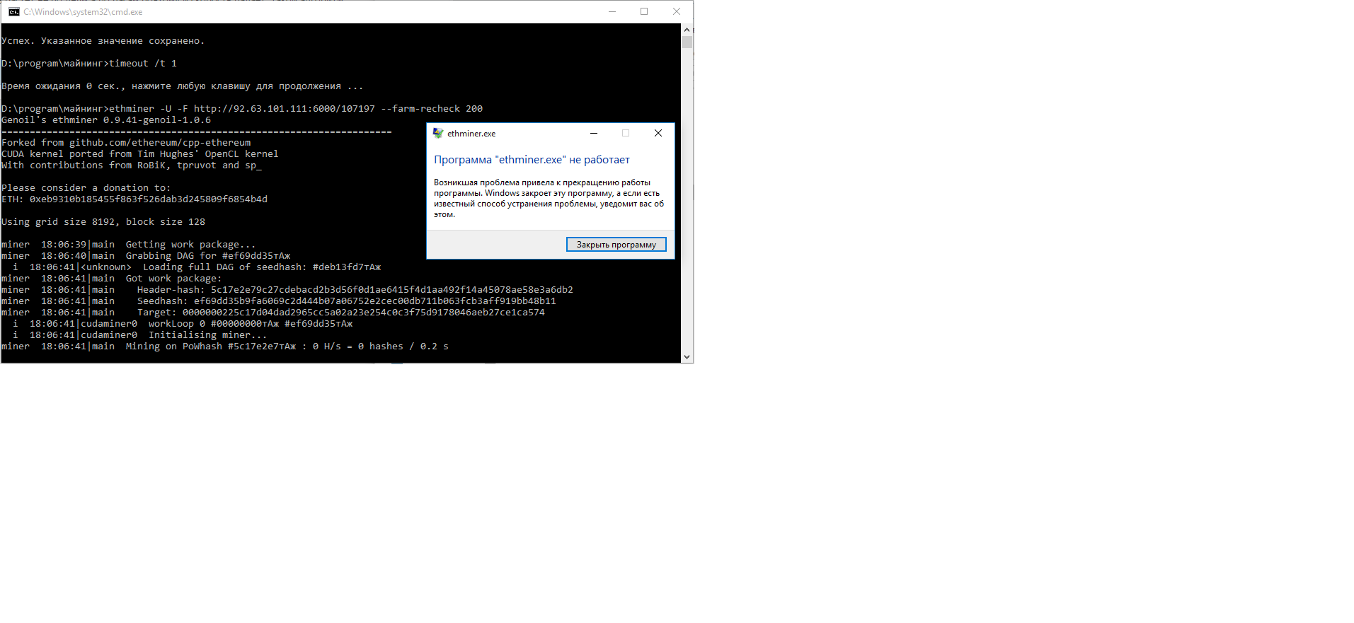 Aleksandr Degtiarev писал(а): возможно проблема в недостаточном количестве видеопамяти,из-за этого не создается dag файл,а он имеет обьем 1.3гб(где-то в этой ветке форума читал).а у вас видеокарта на 1гб,да и в батнике нужно прописывать -U вместо -G,так как ваша видеокарта фирмы нвидиа и соответственно профитнее использовать техногию CUDA при майнинге(это и указывает запись -U в батнике) вместо -G - это для фирмы AMD |