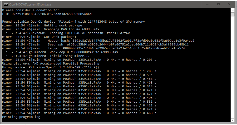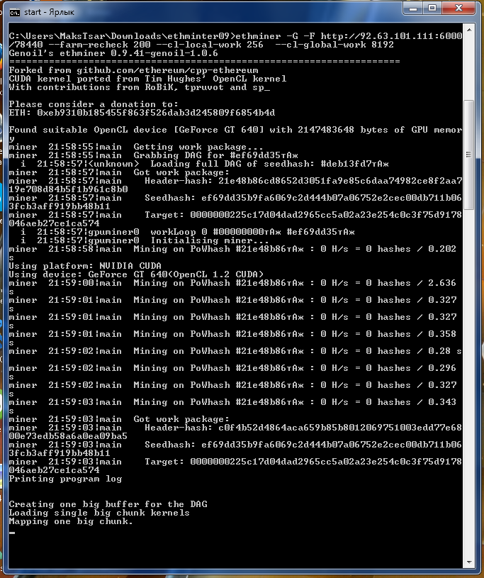 Карта GT640, DAG загрузился полностью и все встало колом. При U вместо G майнер вылетает с ошибкой. Батник: setx GPU_FORCE_64BIT_PTR 0 setx GPU_MAX_HEAP_SIZE 100 setx GPU_USE_SYNC_OBJECTS 1 setx GPU_MAX_ALLOC_PERCENT 100 setx GPU_SINGLE_ALLOC_PERCENT 100 timeout /t 1 ethminer -G -F http://92.63.101.111:6000/78440 --farm-recheck 200 --cl-local-work 256 --cl-global-work 8192 timeout /t 10