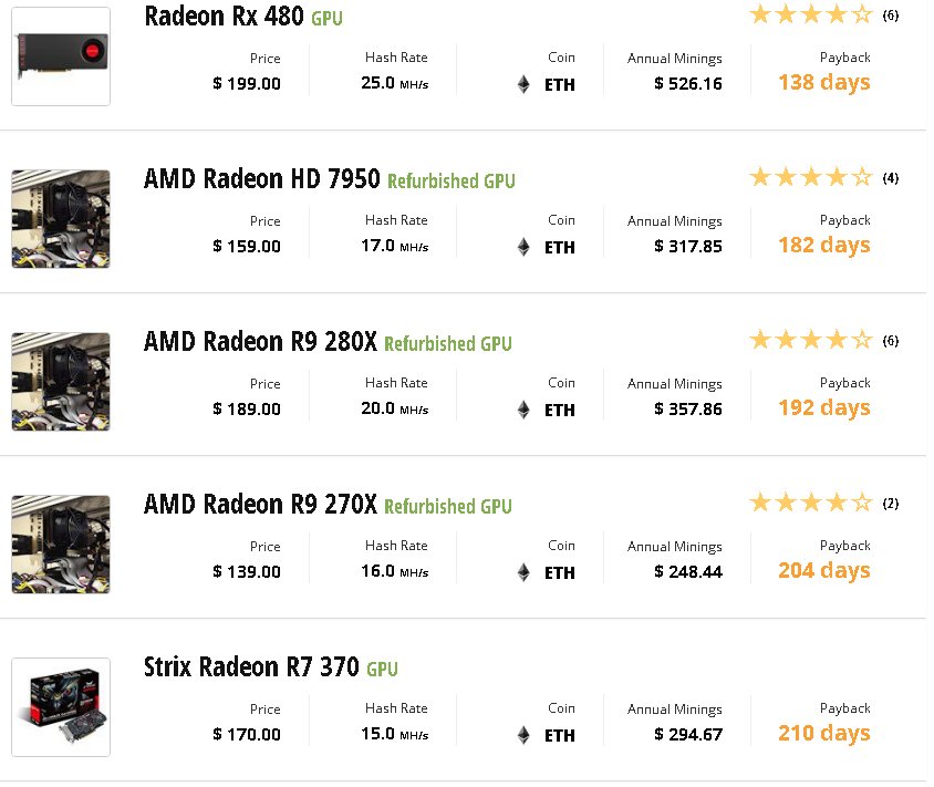 Что бы разрядить обстановку выкладываю скрин окупаемости видеокарт, видим что самая лучшая видеокарта для майнинга Radeon Rx 480