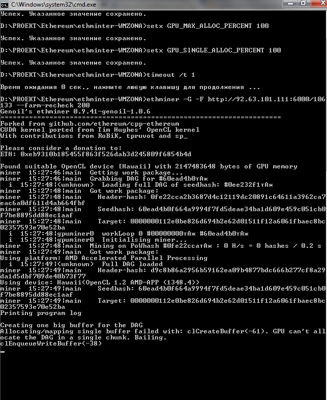 Нужно больше подробностей(ОС, версия драйвера,сколько ОЗУ и т.д.) Ниже цитирую рекомендации с сайта: Про ошибку "-38" написано в подробностях по эфиру. Распространённые проблемы с майнингом и их решение Creating one big buffer for the DAG Allocating/mapping single buffer failed with: clCreateBuffer(-61). GPU can’t allocate the DAG in a single chunk. Bailing. clEnqueueWriteBuffer(-38) 1. Попробуйте установить следующие параметры запуска (ПЗ*) setx GPU_FORCE_64BIT_PTR 0 setx GPU_MAX_HEAP_SIZE 100 setx GPU_USE_SYNC_OBJECTS 1 setx GPU_MAX_ALLOC_PERCENT 95 setx GPU_SINGLE_ALLOC_PERCENT 95 2. Для Windows 7/8 установите драйвер Catalyst 15.11.1 попробуйте как на стандартных параметрах для запуска так и на ПЗ* 3. Установите драйвер Catalyst версии 14.x попробуйте как на стандартных параметрах для запуска так и на ПЗ* |