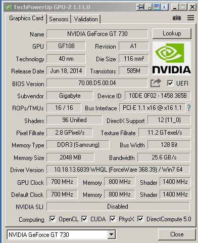 Детонатор последний (хотя пробовал менять на вышедшие летом), видео Gigabyte GF 730 (2 Гб, 128 бит), Вин7х64