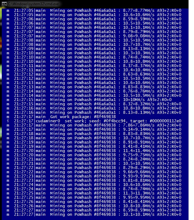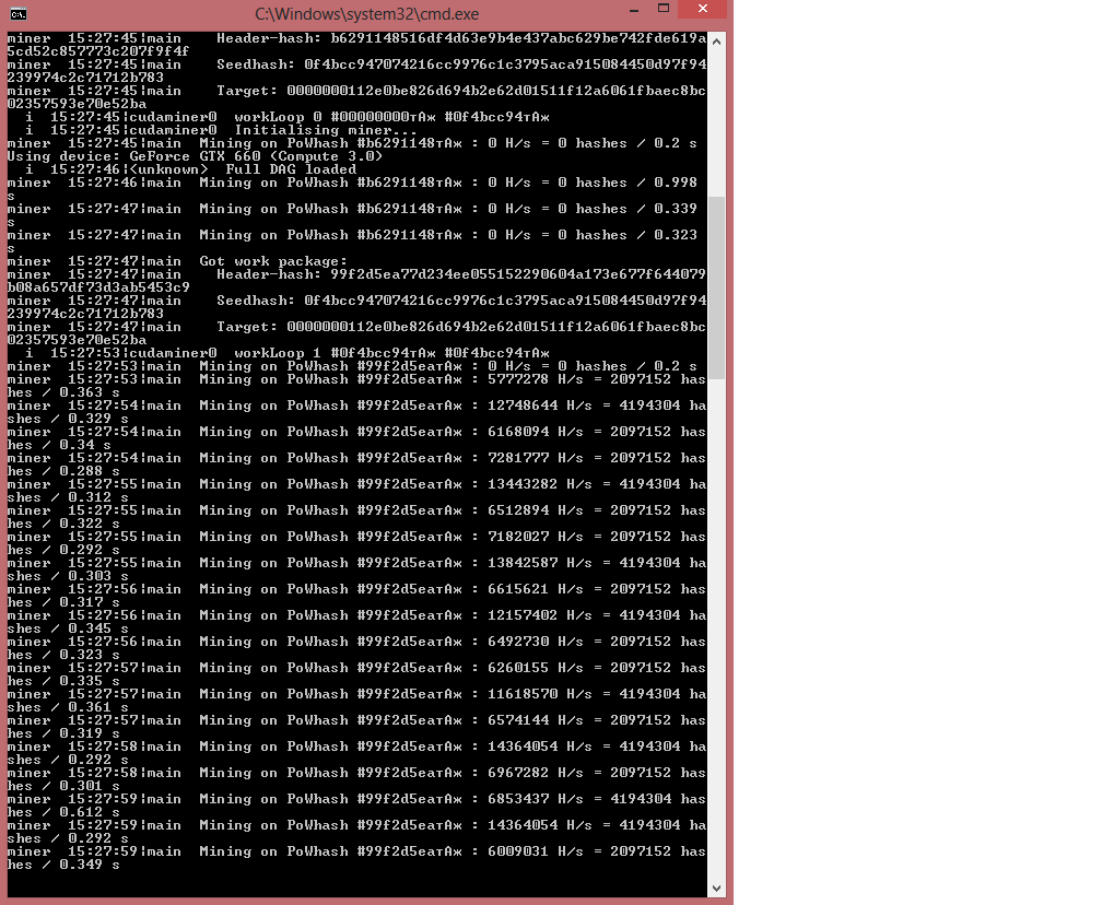 GTX660 не Ti, но немного разогнана (1105/6600), дрова 372.54, майнер ethminer-0.9.41-genoil-1.1.9