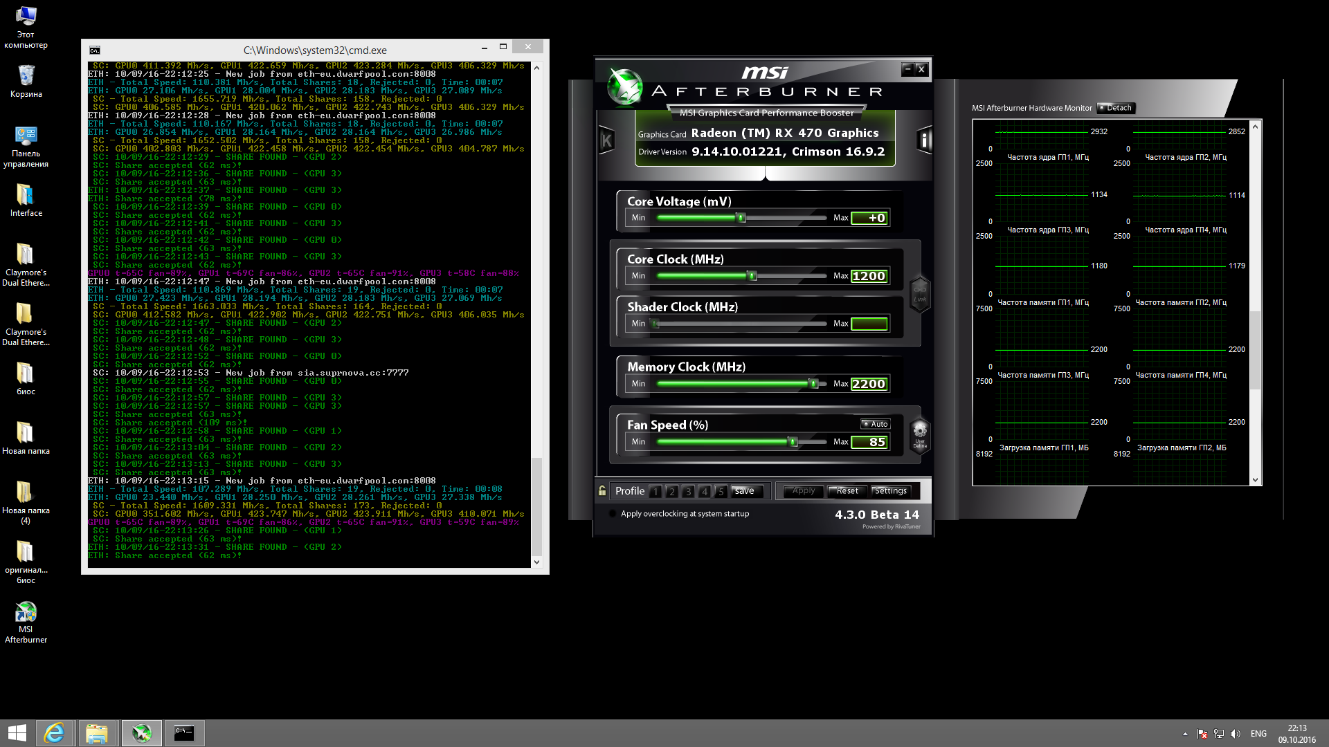 Вячеслав Попов писал(а): У меня пять сапфиров 470 8 гб. Из всех можно получить 30 мх, но есть нюанс. С приемлемым потреблением и тепловыделением - 29,3 мх, на них и майню. Чип-память 1170/2145, VDDC 900 мв, чип 900 мв. (параметры указаны для карт с ASIC quality 80% и выше, для карт с меньшим значением ASIC quality напряжение нужно повышать до 950 мв и выше для стабильной работы).Кроме того, слишком ретивым любителям разгона необходимо контролировать количество ошибок в памяти программой HWINFO. Если работает устойчиво, но сыпет ошибками, необходимо снизить частоту или повысить напряжение. Остальные 0,7 мх на карту с 29,3 до 30 мх резко поднимают потребление, и кол-вл мх на ватт резко снижается. У меня сейчас от стены система на 2011 сокете+ 3 сапфира 470 8 гб кушают с монитором 520 вт, без монитора 485 вт., на 30 мх кушало на 150 вт выше. У кого халявное электричество, тот может 30 мх выжимать, лишь бы охлаждение было нормальным. |