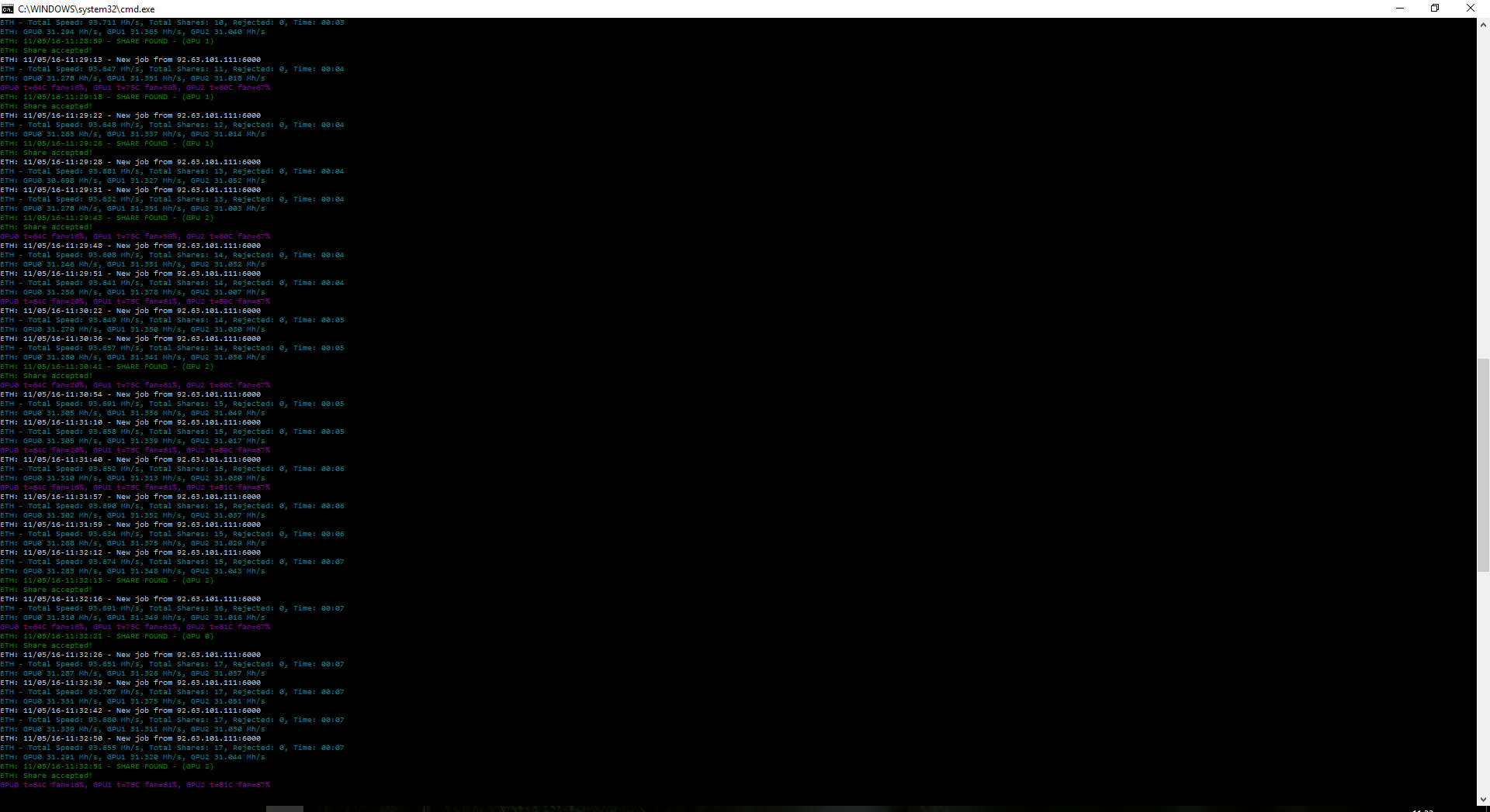 Евгений Малахо писал(а): Я ж объяснил, у меня 4 воркера. Грубо говоря, 1, 2, 3, 4 Это физические компы. 1,2 и 4-й - майнили эфир. 3-й- комп для всяких перетурбаций с железом, типа, тестирование, всякие эксперименты с майнерами и т.п. Когда была последняя выплата, на 1,2 и 4-м был 0. На 3-м было 660 решений.Сейчас на 3-м 726 решений. 137700-700 (грубо)=137000 Но никак не 136000 Разве что мне кто-то на моих воркеров под шумок лиры накапал, но я что-то с трудом в такое верю))) Получается, нужно не просто строку с информацией выводить, а выводить ее по каждому логину, чтобы было видно, на каком логине какое количество решений от какой криптовалюты. Это еще не все))) В строке явно забита формула. Так вот, у меня при каждом обновлении страницы сумма выплат РАЗНАЯ, а стоимость одного решения стоит на месте. Подразумевается, что пул находит решения, делит их на всех пропорционально мощностям, и вычисляется стоимость одного решения. Но если решение стОит константу, как может меняться стоимость выплаты при фиксированном количестве найденных решений)))? Где-то в формуле закралась ошибка))) |