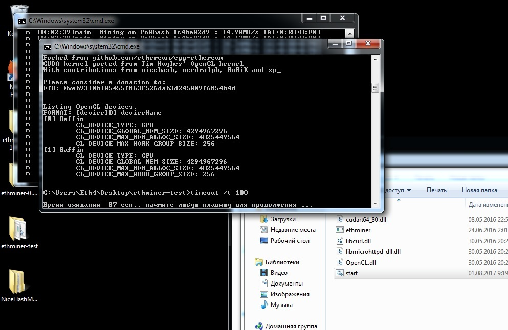 ОЗУ 5Гб, настройки: ethminer -M -G -F http://92.63.101.111:6000/115980 -t 3 --farm-recheck 200 --cl-global-work 16384 --cl-local-work 256