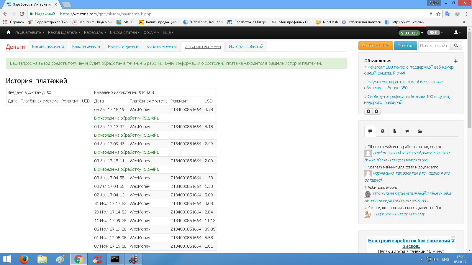 мне как-то пофик, я канеш начну напрягаться если мне не придет за 5 дней обещаных, хотя обычно приходит в течение часа не больше ну и еще - чем меньше сумма вывода тем больше ждать будете, я думаю в первую очередь выводят по 50 и более