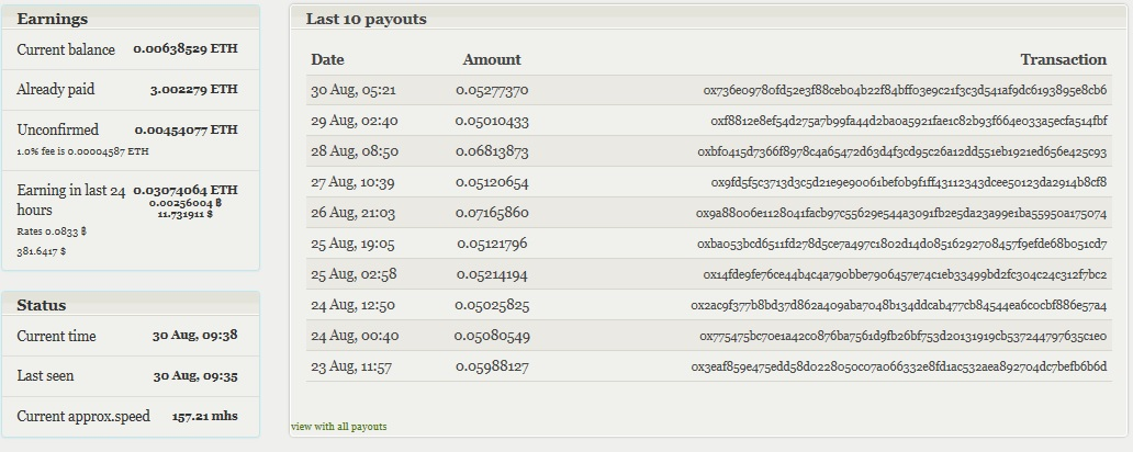 Alexey Shestialtynov писал(а): ![]() Для неверующих выложил список последних транзакции, с другого пула, раньше у меня вылетало по 2 раза в день, сейчас 1 раз, снова перешел на вмзону, так как здесь выгоднее, чем везде, даже с учетом 5% комиссии и вебмани комиссии. |