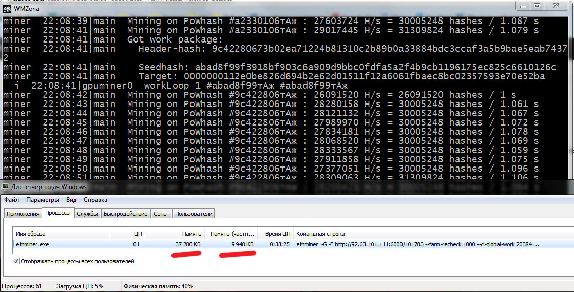 Александ Евсюков: Нет тут дело несколько иначе обстоит. Если посчитать всю используемую память всеми процессами, то получится нехилая "утечка". На самом деле никакой утечки нет. Динамическая память, используемая драйверами видеокарты для работы с видеопамятью, в процессах не отображается. Однако по количеству свободной памяти можно судить о реальном потреблении оперативной памяти. У меня около 1,5Гб съедает запуск майнера. Хотя сам процесс не более 50Мб кушает.