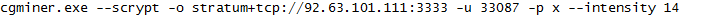 cgminer.exe --scrypt -o stratum+tcp://92.63.101.111:3333 -u 35525 -p x --intensity 12