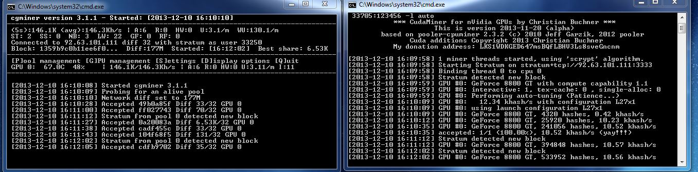 2) cgminer.exe --scrypt -o stratum+tcp://92.63.101.111:3333 -u 33046 -p x -I 18 -g 1 -w 256 --thread-concurrency 15232 --gpu-engine 1000 --gpu-memclock 1300