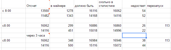 04.07.2016г. с 21-00 до 05.07.2016г. 7-00 (10 часов работы) минус 12 решений в статистике сайта (по сравнению с показаниями майнера).